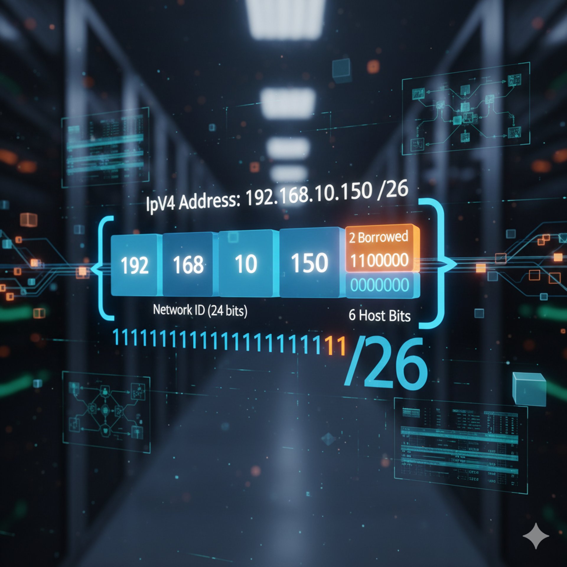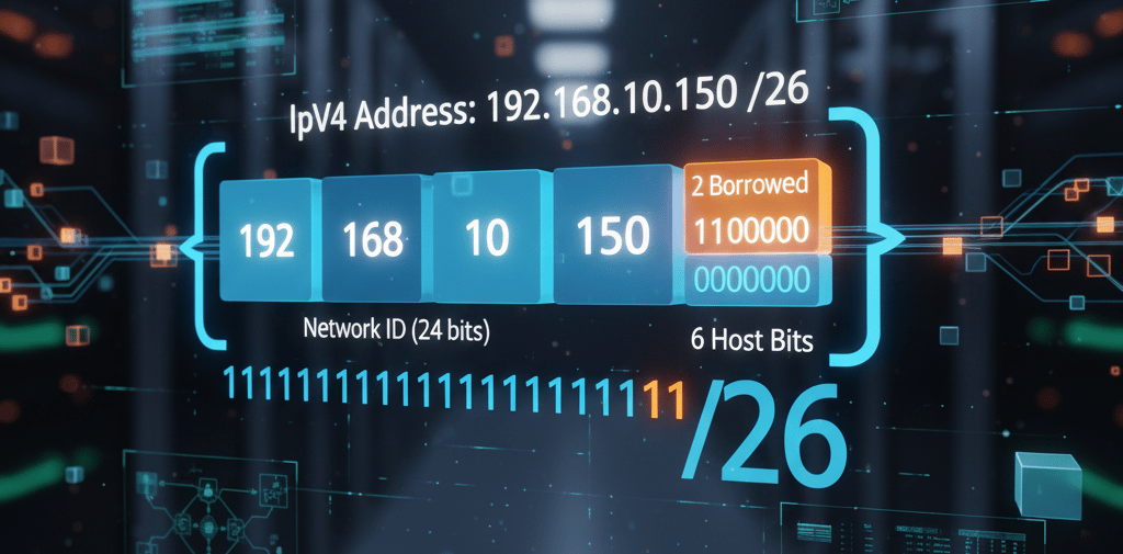 CIDR notation uses a forward slash followed by a number—the prefix length (e.g., 192.168.1.0/26).